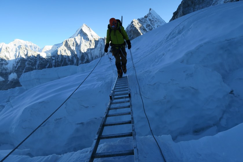 Previous Image Next Image IMG_0280 Crossing a horizonal ladder. You grab a rope in each hand and lean against the anchors. This gives you three points of contact and helps with balance.